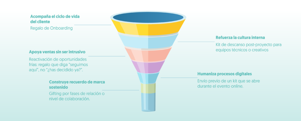 En ciclos de venta largos, el gifting estratégico ayuda a mantener la conversación abierta. No es un incentivo de compra, es un puente de confianza que humaniza la negociación y diferencia tu propuesta de la competencia.